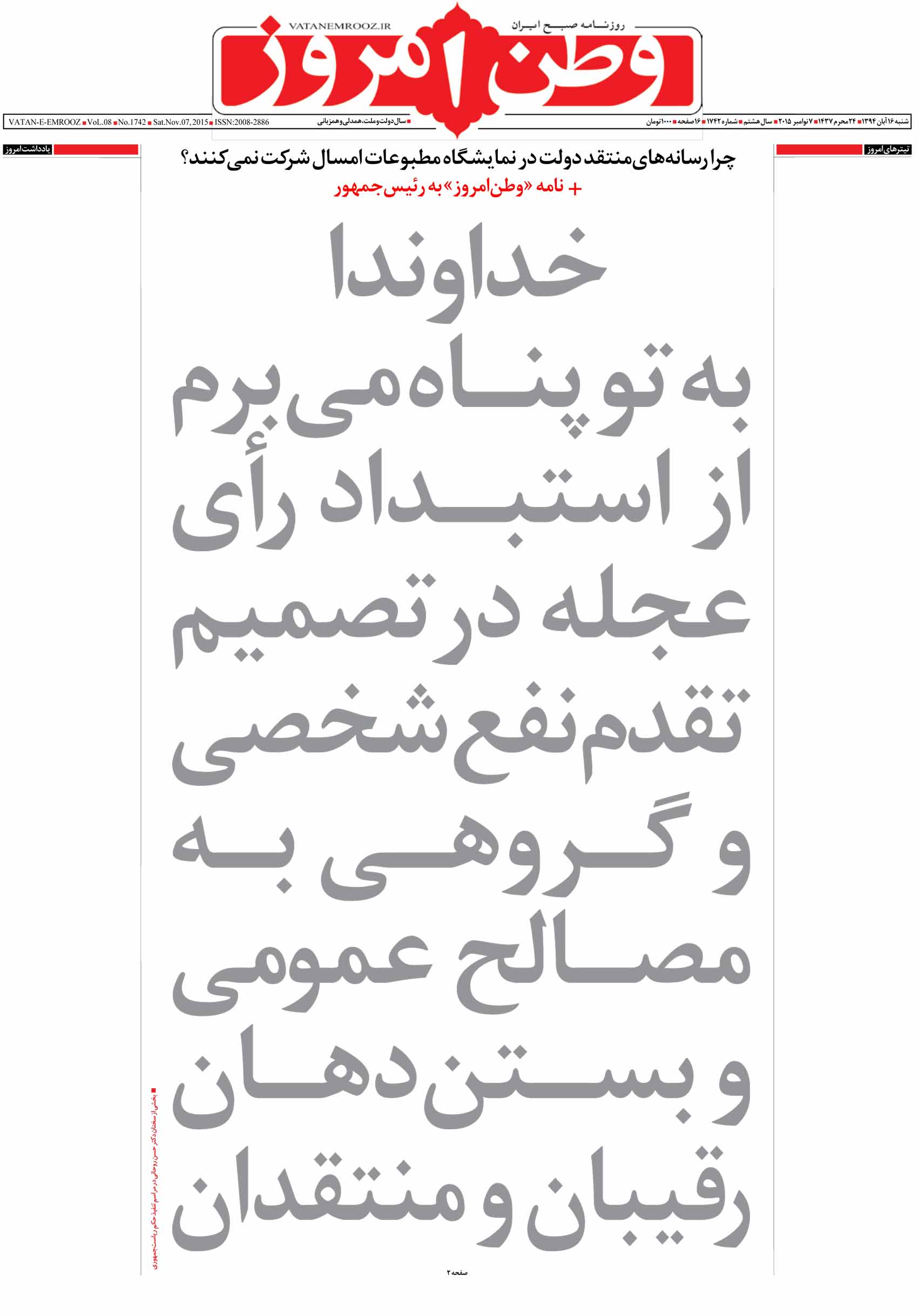خداوندا به تو پنـاه میبرم از استبـداد رأی عجله در تصمیم تقدم نفع شخصی و گـروهی بـه مصـالح عمومی و بسـتن دهـان رقیبان و منتقدان + نامه «وطنامروز» به رئیسجمهور