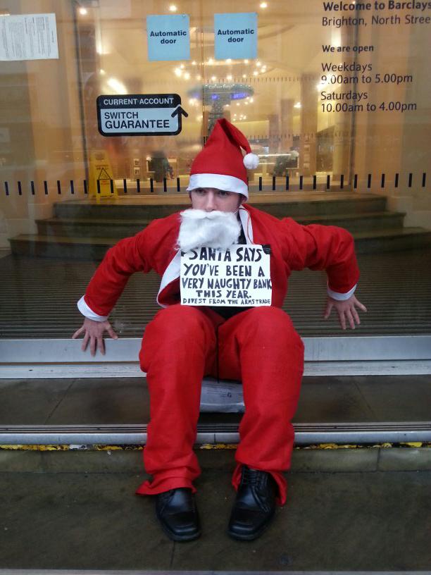 در این پلاکارد خطاب به مدیران و سرمایهگذاران این بانک گفته شده: "بابانوئل میگوید: شما بانک شیطان هستید، با آپارتاید معامله نکنید."