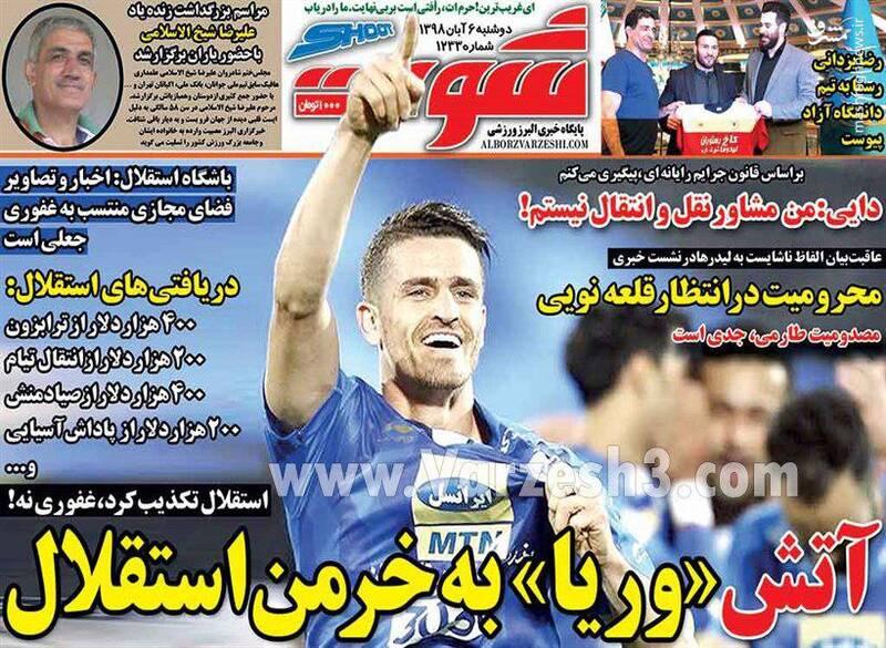 تیتر امروز روزنامه ورزشی شوت با عنوان آتش وریا به خرمن استقلال را مشاهده می کنید. به علت تعطیلات چند روز اخیر فقط این روزنامه در تاریخ ۶ آبان منتشر شده است.