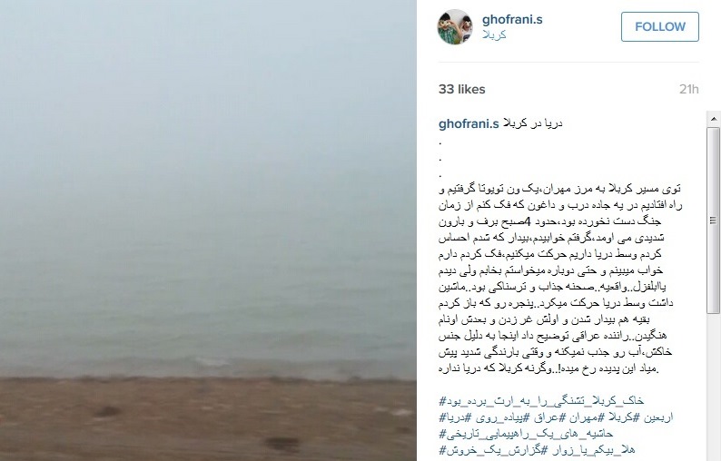 "توی مسیر کربلا به مرز مهران،یک ون تویوتا گرفتیم و راه افتادیم در یه جاده درب و داغون که فک کنم از زمان جنگ دست نخورده بود،حدود 4صبح برف و بارون شدیدی می اومد،گرفتم خوابیدم،بیدار که شدم احساس کردم وسط دریا داریم حرکت میکنیم،فک کردم دارم خواب میبینم و حتی دوباره میخواستم بخابم ولی دیدم یاابالفضل..واقعیه..صحنه جذاب و ترسناکی بود..ماشین داشت وسط دریا حرکت میکرد..پنجره رو که باز کردم بقیه هم بیدار شدن و اولش غر زدن و بعدش اونام هنگیدن..راننده عراقی توضیح داد اینجا به دلیل جنس خاکش،آب رو جذب نمیکنه و وقتی بارندگی شدید پیش میاد این پدیده رخ میده!..وگرنه کربلا که دریا نداره."