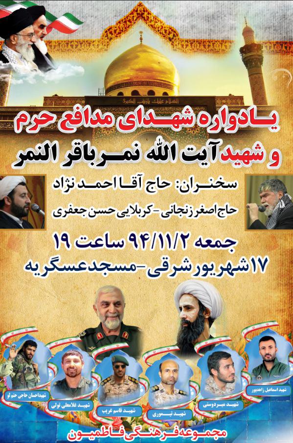 گفتنی ست، این یادواره با عنوان «یادواره شهدای مدافع حرم و شهید آیت الله نمر باقرالنمر» روز جمعه ۲ بهمن از ساعت ۱۹ در مسجد عسکریه گنبدکاووس واقع در خیابان هفده شهریور شرقی برگزار می شود.