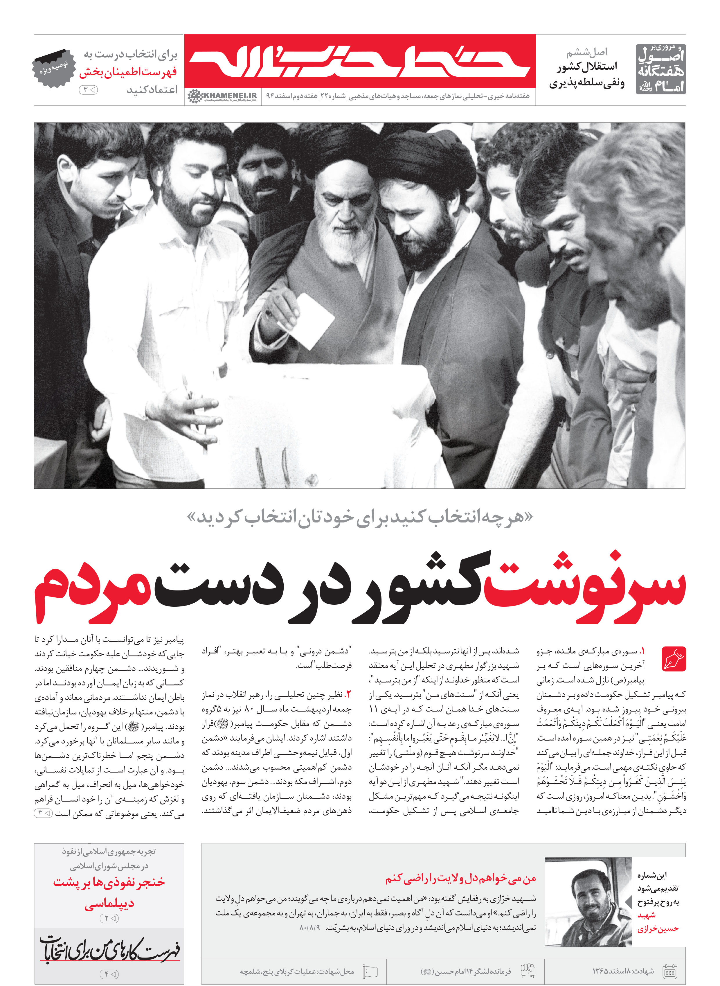 به گزارش حلقه وصل، سخن هفته این شماره نیز به نقش مردم در تعیین سرنوشت کشور در انتخابات از دیدگاه رهبر معظم انقلاب پرداخته است.