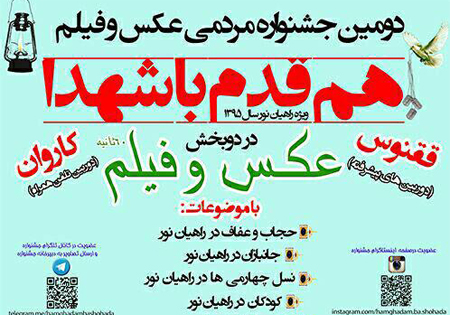 به گزارش حلقه وصل، دومین جشنواره مردمی عکس و فیلم از سفر راهیان نور تحت عنوان "هم قدم با شهدا" با همت ستاد راهیان نور سپاه ناحیه عمار یاسر برگزار میشود.