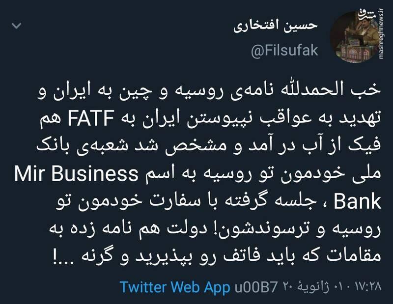 به گزارش حلقه وصل، یک فعال رسانه ای در صفحه شخصی خود در توییتر درباره پشت پرده نامه روسیه و چین برای ایران و تهدید به عواقب نپیوستن به FATF، نوشت: