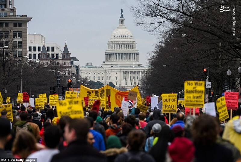 گروههای معترض در واشنگتن و دیگر شهرهای آمریکا به خیابانها آمدند تا حمله هوایی در عراق را که به دستور دونالد ترامپ صورت گرفت و طی آن سردار قاسم سلیمانی فرمانده نظامی ایران شهید شد و نیز تصمیم ترامپ برای اعزام ۳۰۰۰ نظامی دیگر به غرب آسیا را محکوم کنند.