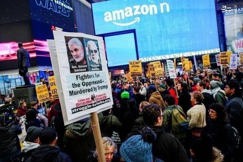 تظاهرات آمریکاییها علیه جنگافروزی ترامپ؛ پرچم ایران و تصاویر شهید سلیمانی در نیویورک.
