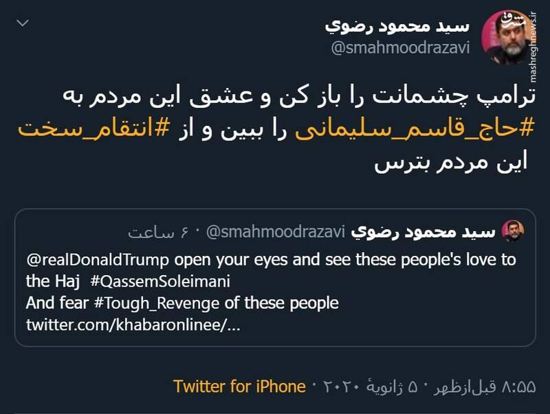 به گزارش حلقه وصل، سید محمود رضوی در صفحه شخصی خود درتوییتر درباره تشییع با شکوه مردم ایران برای حاج قاسم سلیمانی و ابو مهدی، خطاب به ترامپ نوشت:
