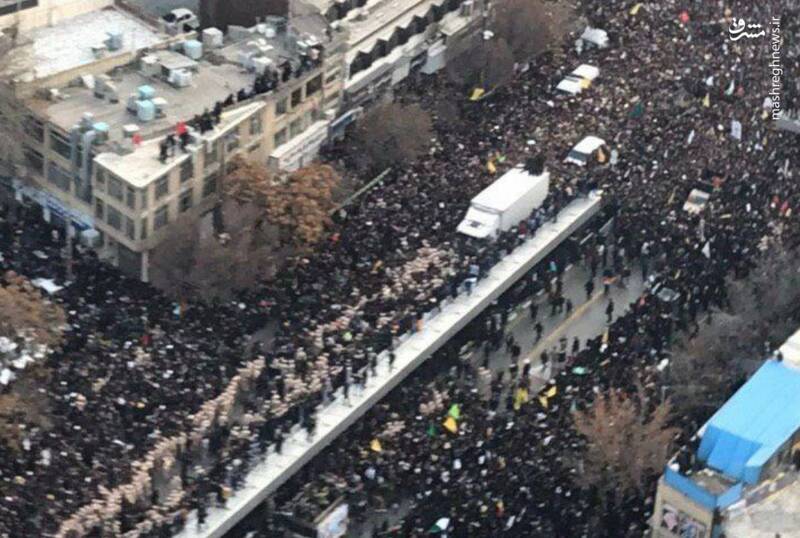 پیکر حاج قاسم سلیمانی هماکنون به میدان پانزده خرداد مشهد رسید و بر روی دستان مردم مشهد قرار گرفت.