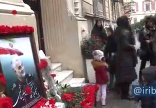 ابراز ارادت مردم جمهوری آذربایجان به مقام شهید حاج قاسم سلیمانی مقابل سفارت ایران در باکو را مشاهده می کنید.