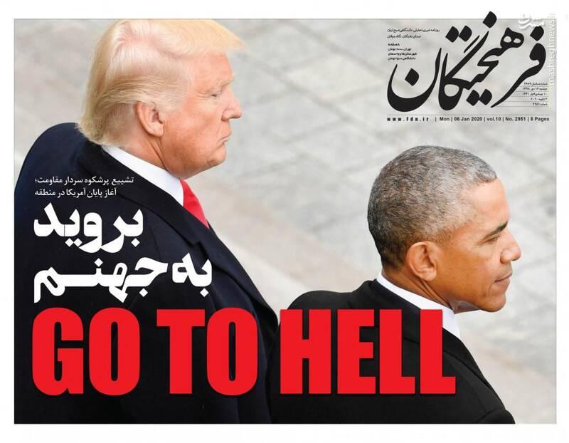 ایران دور تو میگردد/ اولین فتح خون سلیمانی / عظمت آخرین زیارت/ لشکر قاسمیون/ GO TO HELL / طواف در وطن/تیتر تعدادی از روزنامههای صبح امروز است.