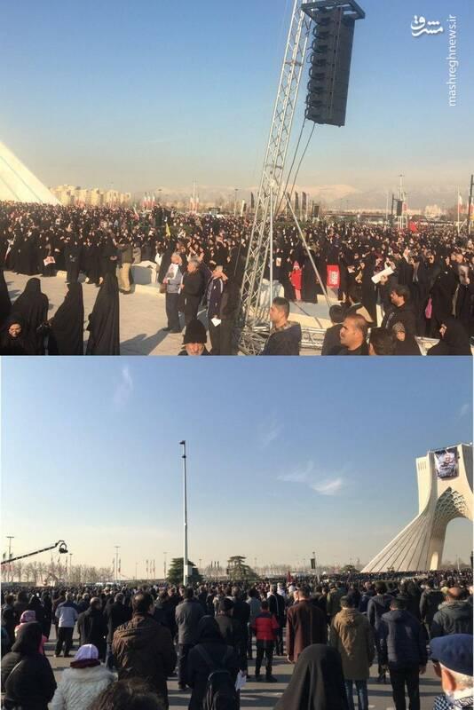 مردم با شنیدن " لحظه وداع رهبری با شهید قاسم سلیمانی و نماز بر پیکر ایشان" در میدان آزادی تهران سکوت کردند و رو به قبله ایستادند.