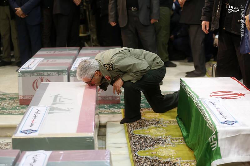 بوسه «سرلشکر باقری»، رئیس ستاد کل نیروهای مسلح بر تابوت شهید ابومهدی المهندس.