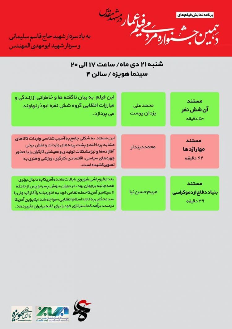 مستند «آن شش نفر» به کارگردانی محمدعلی یزدان پرست، مستند «مهار اژدها» اثر محمددیندار و مستند «بنیاد دفاع دموکراسی» از مریم حسن نیا از ساعت 17 تا 20 امروز در سالن 4 پردیس سینمایی هویزه اکران میشود.