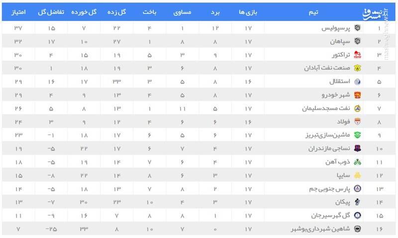 عکس/ جدول رده بندی لیگ برتر در پایان هفته ۱۷