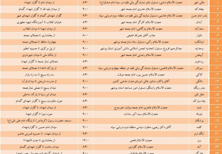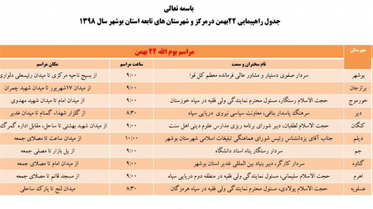 وی ادامه داد: راهپیمایی ۲۲ بهمن در برازجان از میدان ۱۷ شهریور تا میدان شهید چمران، در خورموج از میدان امام (ره) تا میدان شهید مهدوی و در دیر از گلزار شهدای گمنام تا میدان غدیر، در کنگان از میدان شهید بهشتی تا ساحل خلیجفارس، در دیلم از میدان ساعت تا مصلای نماز جمعه، در جم از پل بازار تا مصلا، در گناوه از میدان امام (ره) تا مصلا، در اهرم از مسجد قائم (عج) تا مصلا و در عسلویه از میدان لنج تا پارک ساحلی برگزار میشود.