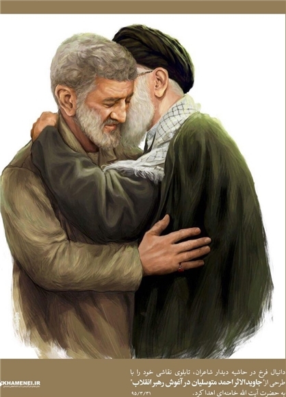 دانیال فرخ هنرمند خوش ذوق با ترسیم تصویر حاج احمد متوسلیان در آغوش رهبر انقلاب این هدیه ویژه را به رهبر انقلاب تقدیم کرد.