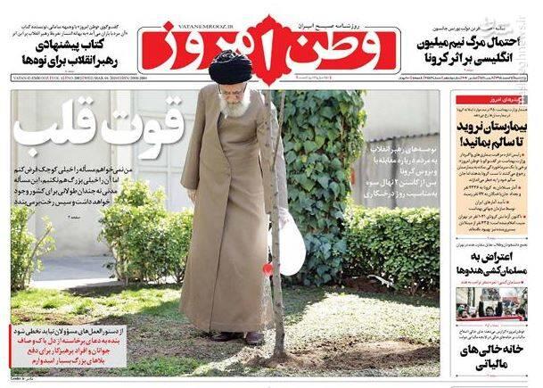 کیهان: همه دستگاهها موظف به همکاری با وزارت بهداشت هستند وطن امروز: قوت قلب جوان: داروی ایرانی کرونا از بقیهالله میآید خراسان: تخطی از دستورات بهداشتی گناه است صبح نو: دشواریها به لطف تو آسان شود افکار: کسب و کارهای خرد زیر فشار کرونا! جام جم: معضل توزیع فرهیختگان: شجره طیبه عقلانیت رسالت: همه پای کار وزارت بهداشت حمایت: برگزاری علنی دادگاه محتکران در شعب ویژه قدس: احکام سنگین در انتظار محتکران ابتکار: بازار شب عید غرق در رکود ایران: رکود کرونایی شرق: حکم حکومتی بودجه شهروند: حکم حکومتی برای لایحه ۹۹ همدلی: حکم حکومتی برای بودجه آفتاب: مشاغلی که با کرونا رونق گرفتند همشهری: کارگران فراموش شدگان کرونا اطلاعات: رهبر معظم انقلاب: همه دستگاهها موظفند با وزارت بهداشت همکاری کنند مردم سالاری: حکم حکومتی رهبری برای بودجه ۹۹ سازندگی: ضرورت بازسازی اصلاحات صدای اصلاحات: یارانه کرونا؛ تسکینی برای خسارت ابرار اقتصادی: دورکاری کارکنان دستگاههای اجرایی بلامانع شد جهان صنعت: حکم حکومتی تجارت: تمدید مهلت بخشودگی مالیاتی دنیای اقتصاد: کرونا با اقتصاد جهان چه میکند؟