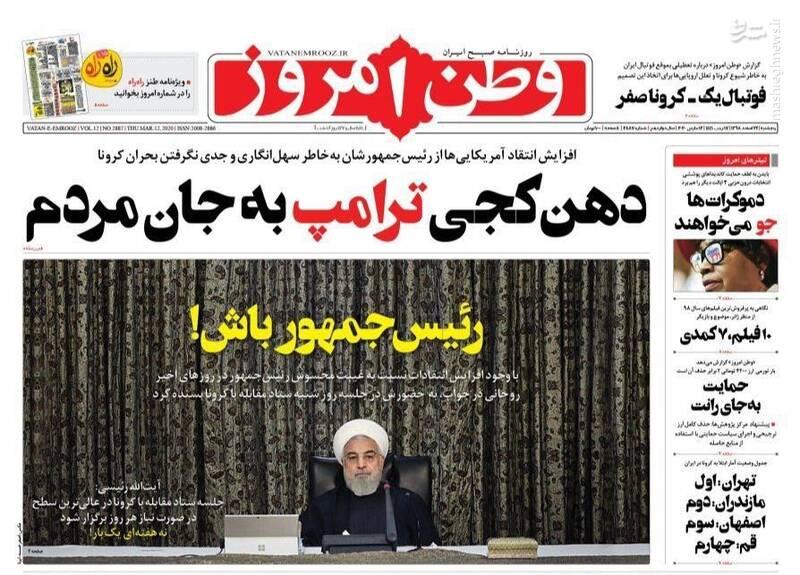 کیهان: اختیارات لازم داده شده همه باید به وزارت بهداشت کمک کنیم وطن امروز: رئیس جمهور باش! جوان: ۱۰۰ هزار پاسدار و بسیجی علیه کرونا خراسان: به مشهد سفر نکنید فرهیختگان: خارج از گود رسالت: کرونا درد دوم حمایت: پیگیری و هماهنگی روزنامه برای غلبه بر کرونا قدس: رئیس تازه نفس ایران: باید زنجیره شیوع کرونا قطع شود شرق: پاسخ به درخواست مکرر وزرا آفتاب: خیابانهای تهران شلوغ شده است! ابتکار: مصائب دولت کرونازده شهروند: تردد در استانها باید به حداقل برسد همشهری: رمز عبور از بحران اطلاعات: روحانی: غلبه بر اپیدمی مستلزم همکاری کامل مردم است مردم سالاری: شایعات کرونایی ممنوع! صدای اصلاحات: در حاشیه! جهان صنعت: عافیت طلبی ابرار اقتصادی: اختصاص ۴۰۰ میلیارد تومان برای مقابله با بیماری کرونا در تهران تجارت: خصوصی سازی همچنان یک ضرورت دنیای اقتصاد: پیام استانی از بازار مسکن