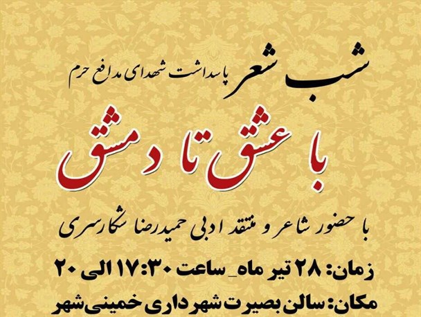 به گزارش حلقه وصل، کانون بسیج هنرمندان شهرستان خمینی شهر در نظر دارد شب شعری با عنوان «با عشق تا دمشق» با موضوع شهدا به ویژه شهدای مدافع حرم و با حضور شاعر و منتقد ادبی «حمیدرضا شکارسری» برگزار کند.