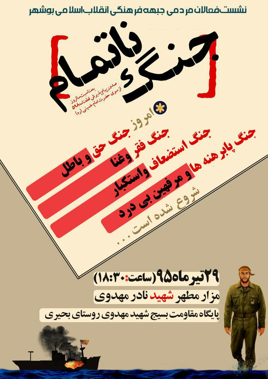 کازرونی تصریح کرد: روزگذشته سه شنبه 29 تیرماه از ساعت 19 مراسم آغاز و تا 22:30 با حضور بیش از 80 فعال فرهنگی از شهرستان های دشتی، بوشهر، دشتستان و کنگان در مزار مطهر شهید نادر مهدوی با همکاری پایگاه مقاومت بسیج شهید مهدوی روستای بحیری برگزار گردید.