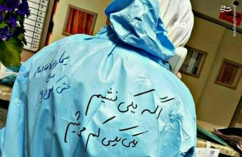 نوشته قابل تأمل روی لباس یکی از پرستاران بیمارستان امام خمینی.