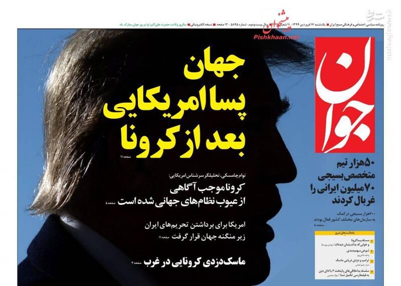 کیهان: پیشنهاد ۵۰ کارشناس برای کاهش پیامدهای اقتصادی کرونا وطن امروز: طاعون لیبرال دموکراسی جوان: جهان پساامریکایی بعد از کرونا خراسان: چراغ سبز به ترافیک کرونایی! صبح نو: هشت مانع اساسی جهش تولید افکار: تعیین حداقل دستمزد کارگران به کجا رسید؟ جام جم: نه! این قرارمون نبود فرهیختگان: پایتخت ۷ رسالت: سیل کرمان در کرونا غرق شد حمایت: اقدام شاخص ایران در مدیریت کرونا قدس: جهان علیه گروکشی کرونایی آمریکا ایران: خطر! آرمان ملی: شیب صعودی بورس_ رکود بازار خودرو آفتاب: ترافیک مرگ همدلی: در پرونده شلیک به هواپیمای اوکراینی کسی بازداشت نشد شهروند: در خواست برای اقدام فوری همشهری: تنش خانوادگی در قرنطینه ابتکار: خیزش دلار با چراغ سبز ارز نیمایی صدای اصلاحات: نقش مهم جوانان در تحقق جهش تولید مردم سالاری: درخواست اروپا برای لغو تحریمهای ایران تجارت: اجماع جهانی علیه تحریمها دنیای اقتصاد: ۳ رکورد بورس پس از تعطیلات