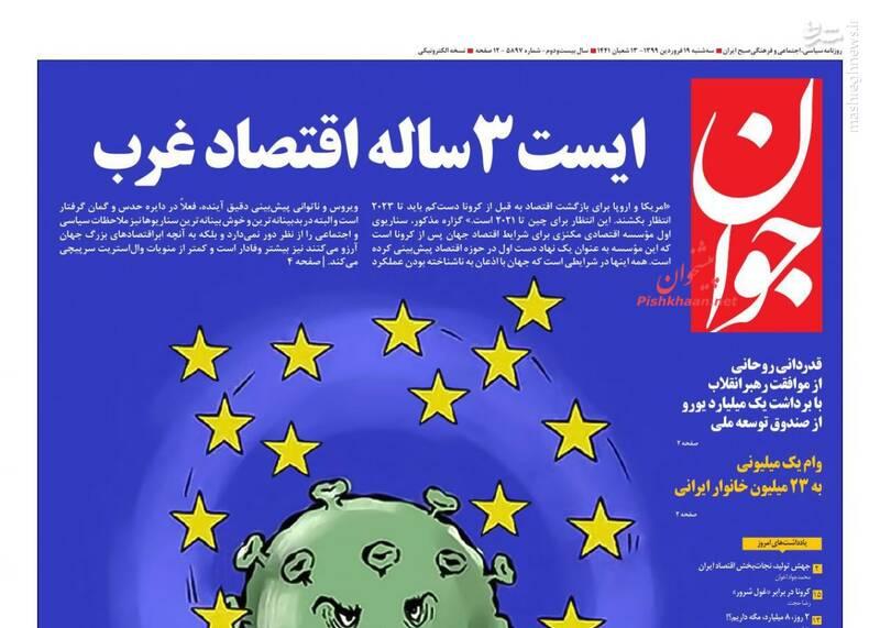 کیهان: نهضت نیکوکاری برای حمایت از محرومان در مقابل کرونا وطن امروز: اقتصاد معطل شرمنده روز مبادا جوان: ایست ۳ ساله اقتصاد غرب خراسان: جزئیات افزایش حقوق بازنشستگان صبح نو: «کالگزیت» آتش زیر خاکستر آمریکا افکار: عادی سازی کرونا خدمت به کشور نیست جام جم: تهران در فاز همه گیری فرهیختگان: تست کرونا روی تحریم رسالت: صبر قاتل کرونا حمایت: سلامت مردم باید در اولویت باشد قدس: اختصاص یک میلیارد یورو برای مقابله با کرونا اعتماد: شوخی تلخ شرق: مبارزه ایرانیزه با کرونا آرمان ملی: کرونا؛ مخالفان در برابر رئیس جمهور ایران: هم سلامت هم معیشت شهروند: یک میلیارد یورو برای مقابله با کرونا آفتاب: لطفا پاسخگو باشید همدلی: روزهای پرکار کرونا ابتکار: درمان کرونای اقتصاد با مسکن یارانه! همشهری: سوگ خاموش اطلاعات: پرداخت یک میلیون تومان به ۲۳ میلیون خانوار صدای اصلاحات: فرافکنی رئیس! دنیای اقتصاد: دژ آلمانی مقابل ویروس چینی ابرار اقتصادی: اختصاص اعتبار یک میلیون تومانی به همه یارانه بگیرها جهان صنعت: تبعیض سیستماتیک