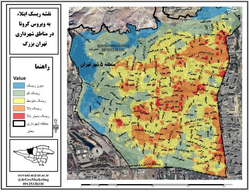 به گزارش حلقه وصل، تصاویر زیر، بخشی از نتیجه غربالگری ویروس جدید کرونا (Covid-۱۹) در جمهوری اسلامی ایران است که در آن حدود ۷۰ میلیون نفر از جمعیت ۸۰ میلیون نفری ایران از طریق حضوری، تلفنی و اینترنتی مشارکت داشتند و هم اکنون نتایج آن به وسیله ارتباط با بیمارستانها و خانه های بهداشت، راستی آزمایی و همپوشانی شده و برای هر فرد در هر منطقه رصد میشود. کانال drGeoMarketing با تبدیل این اطلاعات به اینفوگرافی، مناطق پُر خطر و با ریسک بالا در مناطق بیست و دو گانه تهران بزرگ و نیز مناطقی که از جهت ویروس جدید کرونا در ریسک پایین تری هستند را مشخص کرده است.