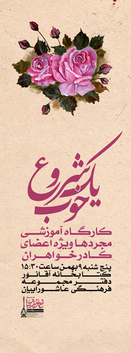 گفتنی است اولین جلسه کارگاه ساعت ۱۵:۳۰ مورخ ۹ بهمن ماه ۹۳ در دفتر مجموعه فرهنگی عاشوراییان تشکیل خواهد شد.