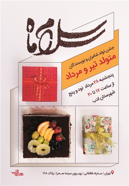 در پایان گفتنی است که جشن سلام ماه گرامیداشت زادروز شاعران و داستان نویسان متولد تیر و مرداد با حضور شاعران و داستان نویسان فردا (پنج شنبه) ساعت17 تا 20 در محل موسسه شهرستان ادب به نشانی خیابان شریعتی-سه راه طالقانی - روبروی سینما صحرا - پلاک 168 برگزار خواهد شد.