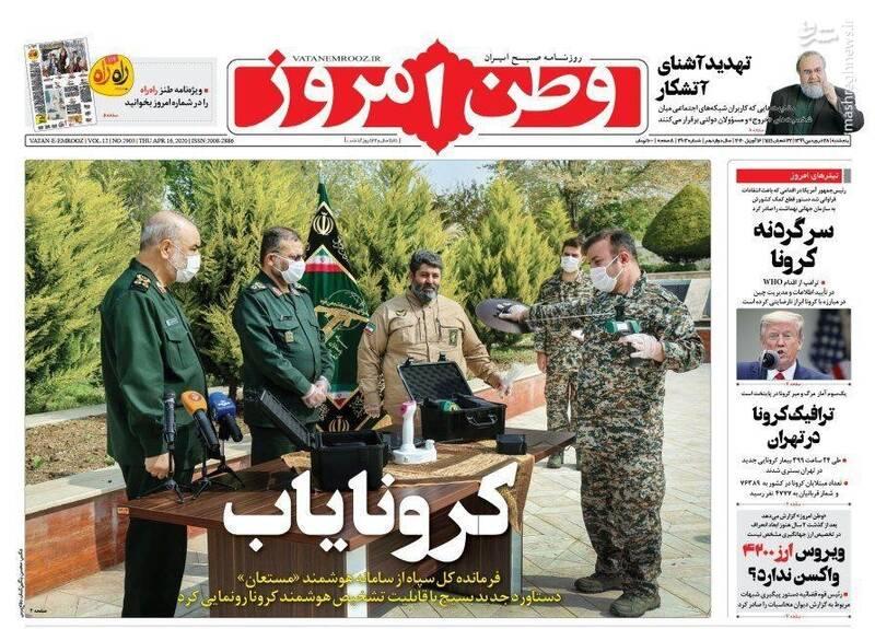حقوق مقامات ایرانی در عصر کرونا/جذب ۷هزار میلیارد تومان از نقدینگی با ۱۰درصد شستا/کارنامه درخشان ارتش/خصوصی سازی یا از این جیب به آن جیب/گزارش ارزی صدردصد غلط بود/تیتر تعدادی از روزنامه های امروز است.