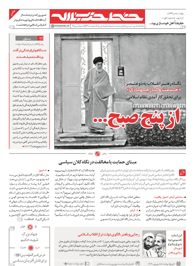 سرویس مبشر صبح: شماره چهل و هفتم نشریه "خط حزب الله" منتشر شد؛ در ادامه گزارشی در خصوص "نگاه رهبر انقلاب به دو عنصر خدمت و کار جهادی برای تحقق کارآمدی نظام اسلامی" را با عنوان "از پنج صبح..." که در این شماره از نشریه خط حزب الله آمده را می خوانیم: