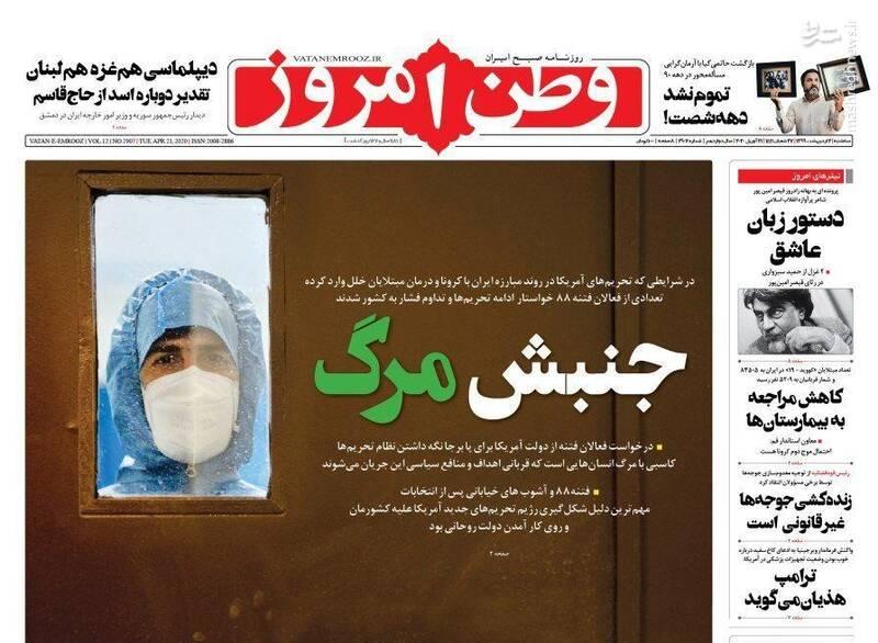 جنبش مرگ/شترسواری کرونا در خطر کوهان دوم!/دست خالی از سپرده ۴/۸ میلیارد دلاری/آسمان پرستاران پرستاره باد/احمدی نژادیها کلید زدند/کمک به مردم مقابل دوربین!/تیتر تعدادی از روزنامه های امروز است.