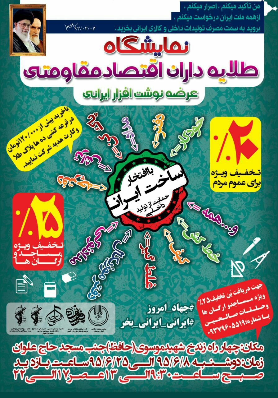 وی اضافه کرد: این نمایشگاه با شعار «جهاد امروز،ایرانی ایرانی بخر»در چهارراه زند خیابان شهید موسوی جنب مسجد حاج علوان از ساعت 9:30 تا 13 و 17 تا 22 در حال برگزاری می باشد.