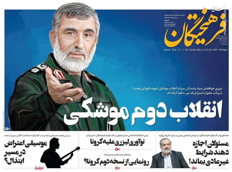کیهان: دنیا زیر دید ایران / پرتاب موفق اولین ماهواره نظامی وطن امروز: انقلاب نور جوان: رصد نظامی جهان با «نور» سپاه خراسان: چشم سپاه در مدار زمین افکار: سپاه پاسداران فضایی شد جام جم: خط مقدم در فضا فرهیختگان: انقلاب دوم موشکی رسالت: آسمان غرق نور شد حمایت: مانور «نور» در فضا ابتکار: مچ اندازی بهارستانیها بر سر تایید صلاحیتها قدس: لاف در غریبی ترامپ شرق: شناسایی ۷۵۰ هزار میلیارد درآمد نامرئی آفتاب: کاسبی ویروسی مخالفان سیاسی همشهری: بنیاد و ستاد در راه بورس اطلاعات: نخستین ماهواره نظامی ایران در مدار زمین شهروند: شکوه رئیس جمهوری از دو دستگی صدای اصلاحات: اقتدار ملی سازندگی: بازگشت تیم بایدن _ اوباما مردم سالاری: ورود نظامی ایران به فضا تجارت: ایران مقاوم در برابر شوک نفتی جهان صنعت: دست بالای گام دومیها ابرار اقتصادی: جولان کرونا در پمپ بنزینهای تهران دنیای اقتصاد: طلای زرد بر دوش طلای سیاه