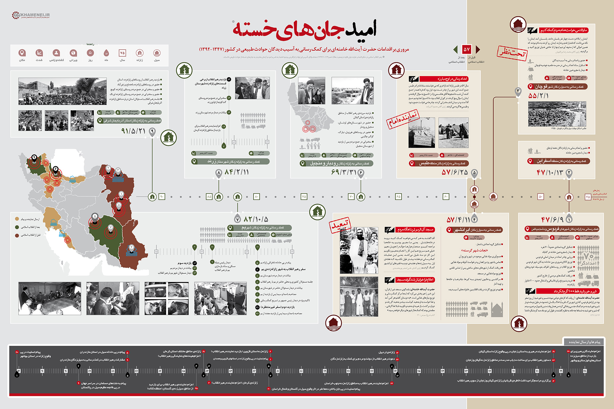 همزمان با ۲۶ دی ماه سالروز دومین حضور رهبر انقلاب در جمع زلزلهزدگان بم، اینفوگرافیک «امید جانهای خسته» -مروری بر اقدامات حضرت آیتالله خامنهای برای کمک به آسیب دیدگان حوادث طبیعی ایران در سالهای ۱۳۴۷ تا ۱۳۹۲- منتشر شد.