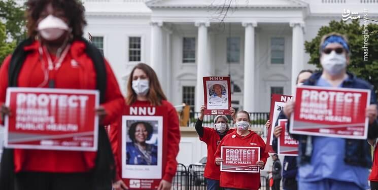 اعضای سازمان ملی پرستاران آمریکا در بیرون از کاخ سفید دست به اعتراض زدند و تصاویری پزشکان و پرستارانی که بخاطر کمبود تجهیزات ایمنی جان باختن را به دست گرفتند.