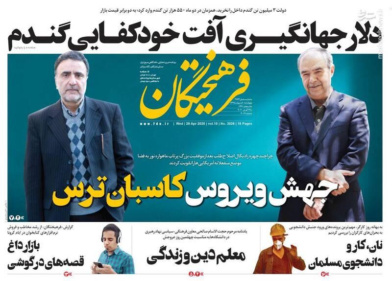 کیهان: آدرس غلط ندهید وطن امروز: سر ایران سلامت جوان: خیال تاراج چین خراسان: ۸ میلیون تومان برای ۴۹ میلیون نفر صبح نو: دستور آزادسازی سهام عدالت از سوی رهبر انقلاب افکار: دریافت تسهیلات کرونایی بدون محدودیت زمانی جام جم: عملیات بانکی علیه وام ازدواج فرهیختگان: جهش ویروس کاسبان ترس رسالت: بازی دو سرباخت حمایت: تفسیر حقوقی تروریستها! قدس: واکسن و داروی ایرانی ضد کرونا ایران: کرانه شکوه همدلی: بورس حباب ندارد آفتاب: کانون وکلا استنکاف کرد شرق: لکنت اصولگرایان در برابر قالیباف اعتماد: خواهان؛ کارگران همشهری: ۶ میلیون شغل در معرض تهدید آرمان ملی: مسمومیت الکل همچنان قربانی میگیرد اطلاعات: روحانی: صرفه جویی و فروش اموال مازاد دولت واجب است شهروند: ۱۰۰ پزشک و پرستار جان باختند مردم سالاری: بورس؛ باور نکردنی قیمت با احتمال سقوط تاریخی! سازندگی: جدایی توکلی از قالیباف صدای اصلاحات: «اصلاحات» نیازمند تحولی بنیادین دنیای اقتصاد: اشتغال بر باد رفته در کرونا تجارت: خصوصی سازی یا تاراج اموال دولت جهان صنعت: همه علیه قالیباف ابرار اقتصادی: عطش بازار برای جذب نقدینگی