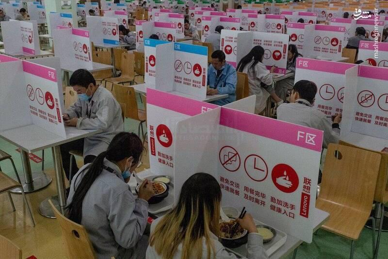 فاصله گذاری در یک سالن غذاخوری کارخانه در چین را میبینید.