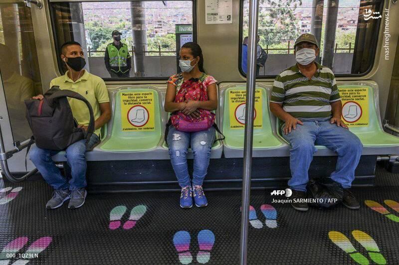 علائم و نشانه های گرافیکی برای حفظ فاصله اجتماعی در مترو مدلین کلمبیا./عکس: AFP