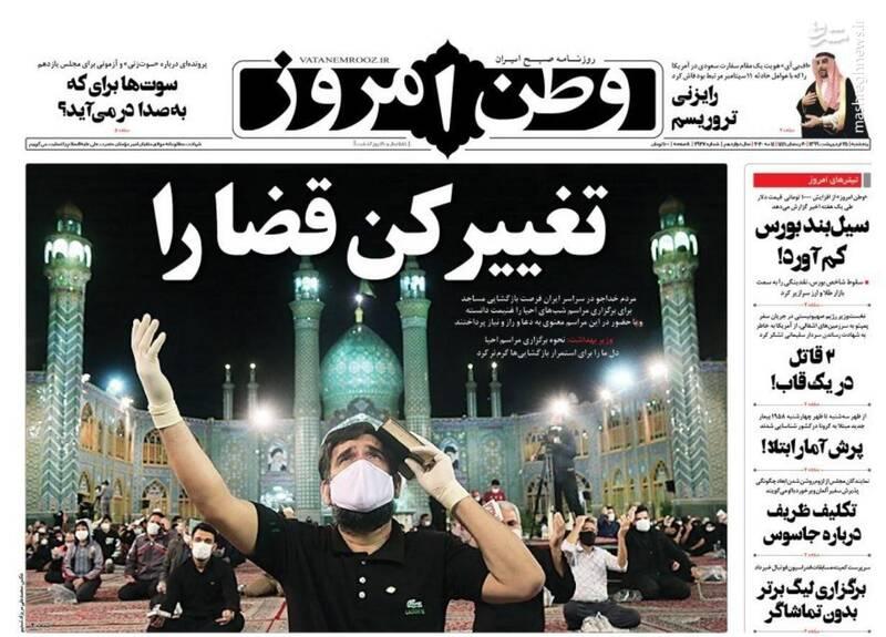 کیهان: سومین تغییر در وزارت صمت؛ مشکل از بازیکنان است یا مربی؟ وطن امروز: تغییر کن قضارا جوان: تور بانکها برای سهام عدالت خراسان: جدال بورس بازان در مرز یک میلیون افکار: ریزش قیمت خودرو ادامه دارد جام جم: شب روسفیدی فرهیختگان: چرا بورس همچنان جذابتر است؟ رسالت: قدر غریبانه حمایت: زوزه تنهایی گرگها! قدس: جاماندگان سهام عدالت، سهامدار میشوند؟ ابتکار: جزر و مد بورس تحت تاثیر هیجانات آفتاب: دور زدن تحریم بدون تولید زنجانی ایران: تلاش کنیم فشار مضاعفی به مردم وارد نشود شرق: ائتلاف علیه قالیباف همشهری: اتوبوس دولت به شهر نرسید اطلاعات: فروش فوق العاده خودرو برای کاهش التهاب بازار شهروند: تاکید رئیس جمهوری بر روشن شدن علت سانحه کنارک مردم سالاری: امکان مذاکره روسیه با ایران برای فروش تسلیحات سازندگی: وزیر معزول در حاشیه صدای اصلاحات: از خطای انسانی تا ردپای ترامپ! جهان صنعت: نامزد بی رقیب تجارت: چرایی بازارهای از دست رفته صادرات ابرار اقتصادی: انتشار ۱۵۰ هزار میلیارد تومان اوراق بدهی دنیای اقتصاد: نقشه راه تهران ضد زلزله