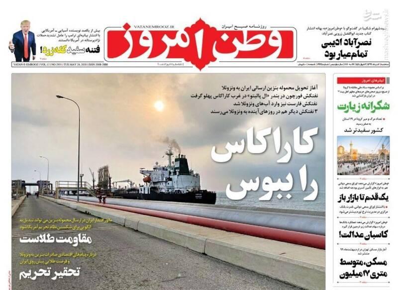 کاراکاس را ببوس /اقتدار نفتکشها بیخ گوش امریکا/تحقیر آمریکا در «ال پالیتو»/تحریم شکنها آمدند/ تصرف در سهام عدالت/تیتر تعدادی از روزنامههای امروز است.