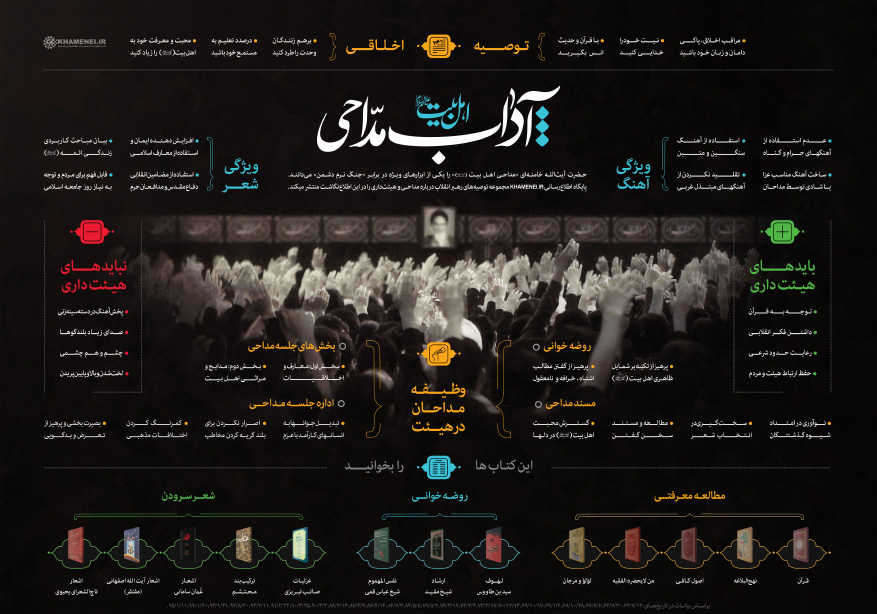 پایگاه اطلاعرسانی KHAMENEI.IR به مناسبت فرارسیدن ماه محرم و ایام عزاداری سید و سالار شهیدان حضرت اباعبدالله الحسین (علیهالسلام) مجموعه توصیههای رهبر انقلاب درباره مداحی و هیئتداری را در اطلاعنگاشت «آداب مداحی اهلبیت (علیهمالسلام)» منتشر میکند.