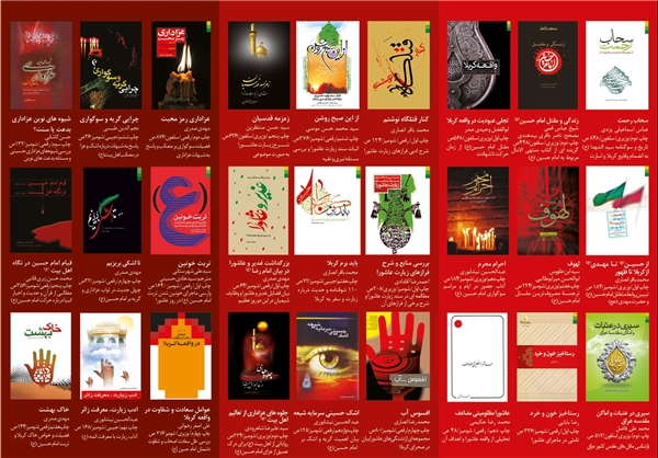 از حسین (ع) تا مهدی (ع) نوشته محمد باقر انصاری، شیوه های نوین عزاداری، سنت یا بدعت نوشته حسن کاشانی، اشک حسینی سرمایه شیعه نوشته عبدالحسین نیشابوری، طفلان خونین نوشته محمد صدری، اشکواره نوشته سید جعفر خلخالی، عاشورا عدالت نوشته محمد رضا حکیمی، افسوس.... آب! نوشته محمد رضا انصاری، عاشورا مظلومیتی مضاعف نوشته محمدرضا حکیمی، ام البنین (س) در آینه شعر نوشته محمد خرم فر، عزاداری رمز محبت نوشته مهدی صدری و امام حسین (ع) نوشته محمد رضا حکیمی عنوان تعدادی از این کتابها هستند.