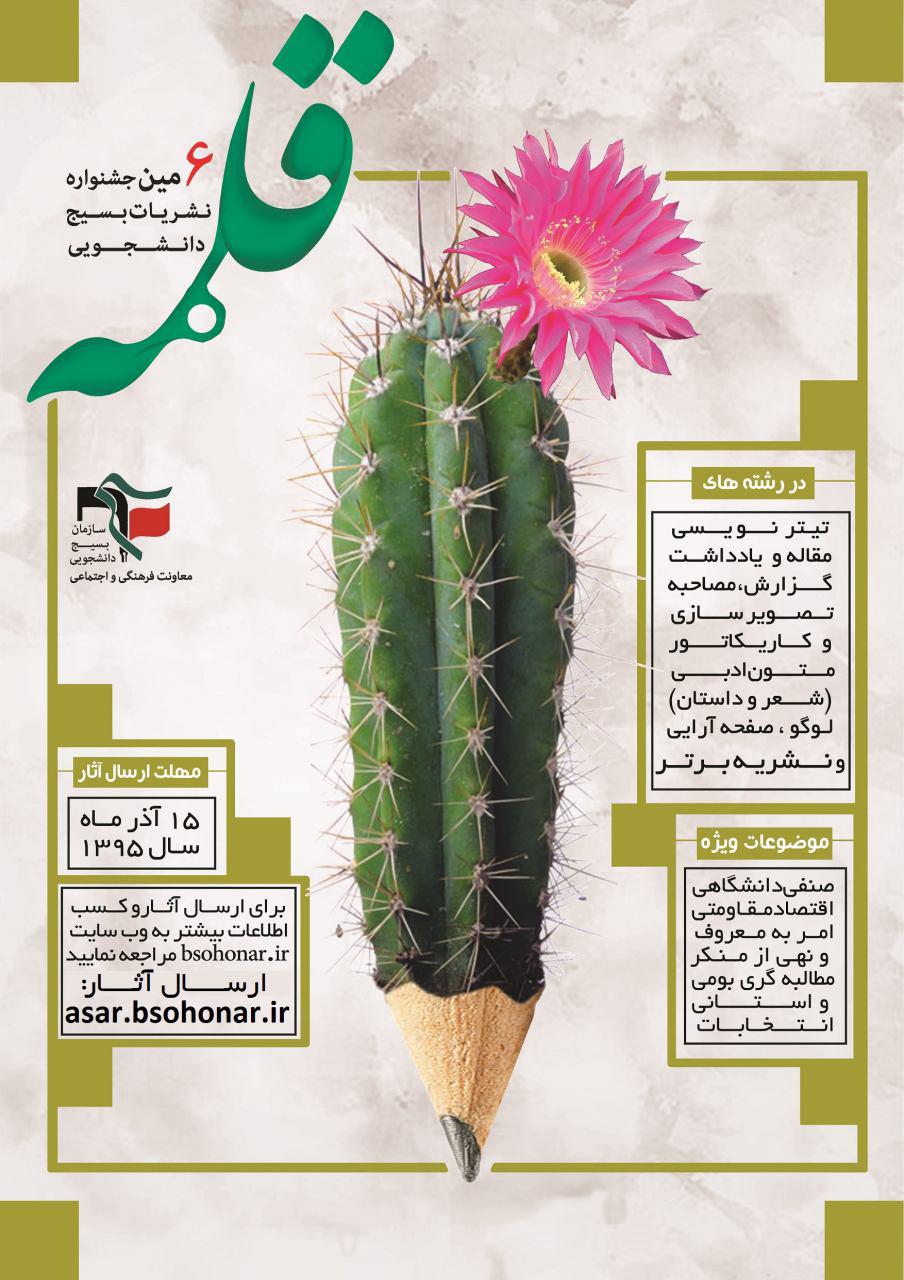 ششمین جشنواره نشریات دانشجویی پس از وقفه سه ساله در راستای ارتقا و همافزایی رسانههای دانشگاهی، در سطح کشور حال برگزاری است و فعالین نشریات بسیج دانشجوو برای شرکت در این رقابت مطالب خود را حداکثر تا ۱۵ آذرماه در وبسایت نشریه به نشانی asar.bsohonar.ir ثبت کنند.