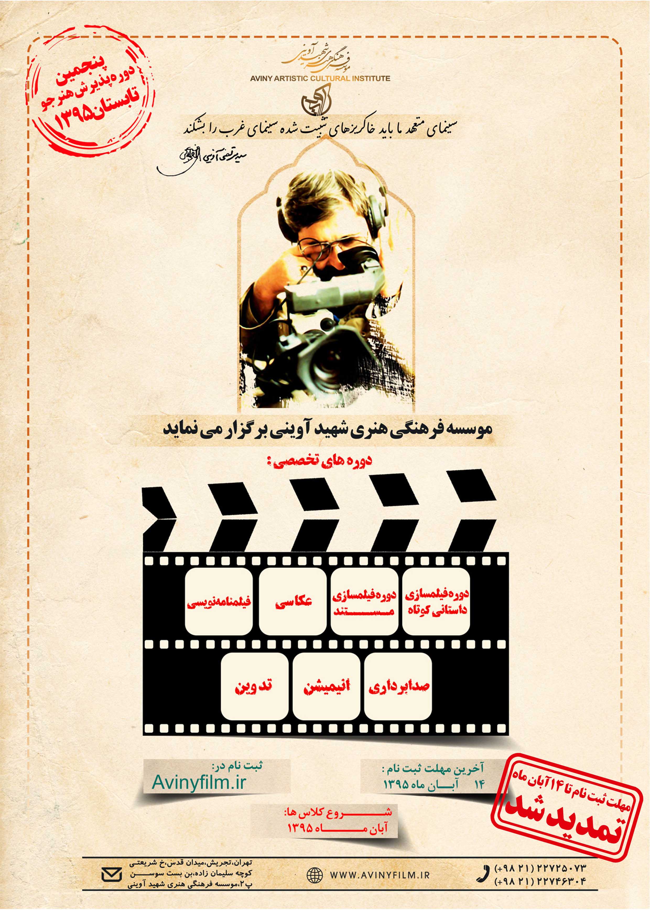 علاقه مندان به آموزش فیلم سازی می توانند نهایتا تا تاریخ 10آبان ماه 1395 با مراجعه به سایت avinyfilm.ir در این دوره ها ثبت نام نمایند.