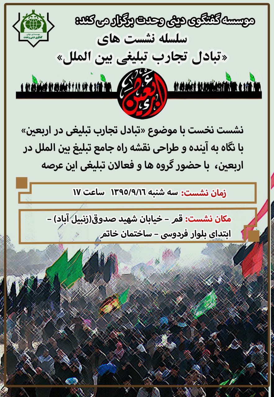 به گزارش سرویس استان های حلقه وصل، نشست تبادل تجارب تبلیغی در اربعین نخستین نشست از سلسله نشست های«تبادل تجارب تبلیغی بین الملل» است که در قم برگزار می شود.