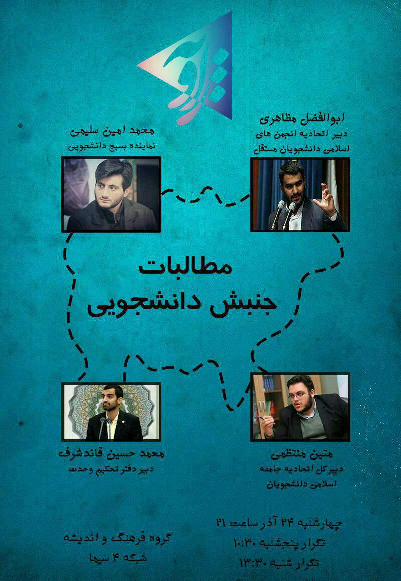 به گزارش حلقه وصل، امشب برنامه زاویه در شبکه چهار سیما، با حضور نماینده تشکلهای دانشجویی به بررسی مطالبات دانشجویی میپردازد.