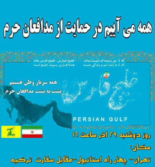 به گزارش حلقه وصل، مراسم اجتماع بزرگ مدافعان حرم استان تهران دوشنبه 29 آذر ساعت 16 مقابل سفارت ترکیه واقع در چهار راه استانبول برگزار میشود.