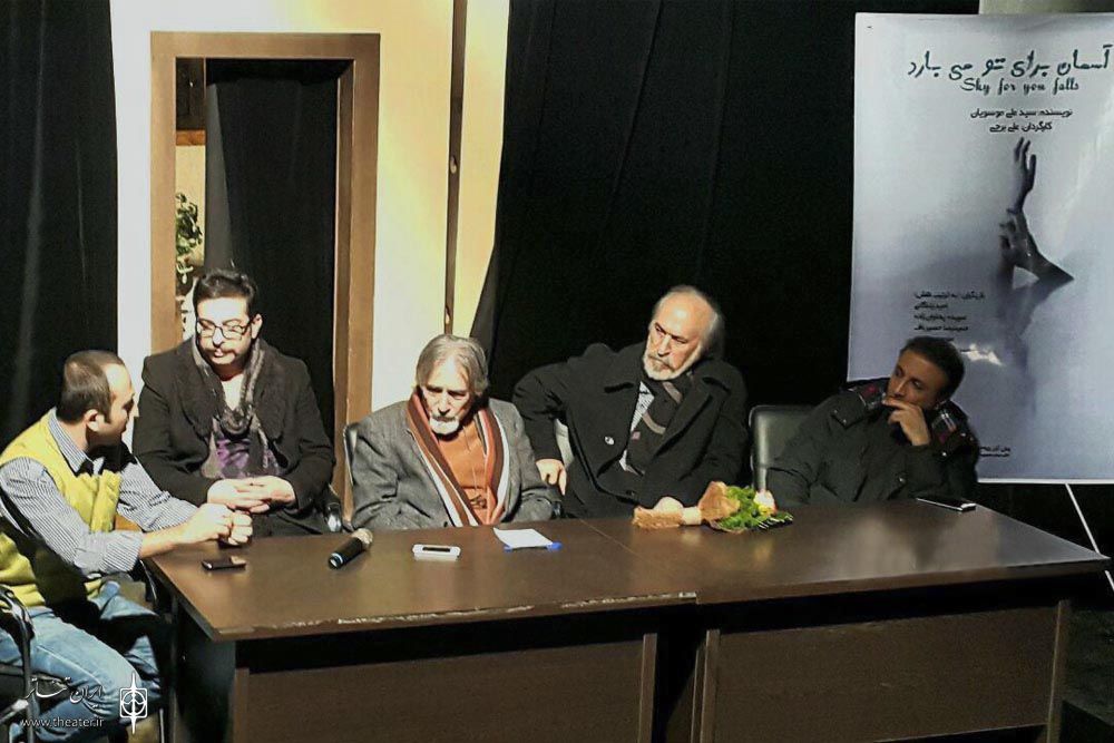 این نشست با حضور علی برجی کارگردان، امیدزندگانی و منوچهرعلیپور بازیگران این نمایش، صمدچینی فروشان منتقد و یحیی نظری کارشناس و مجری این برنامه در حضور جمعی از علاقمندان و تماشاگران نمایش «آسمان برای تو می بارد» برگزار شد.
